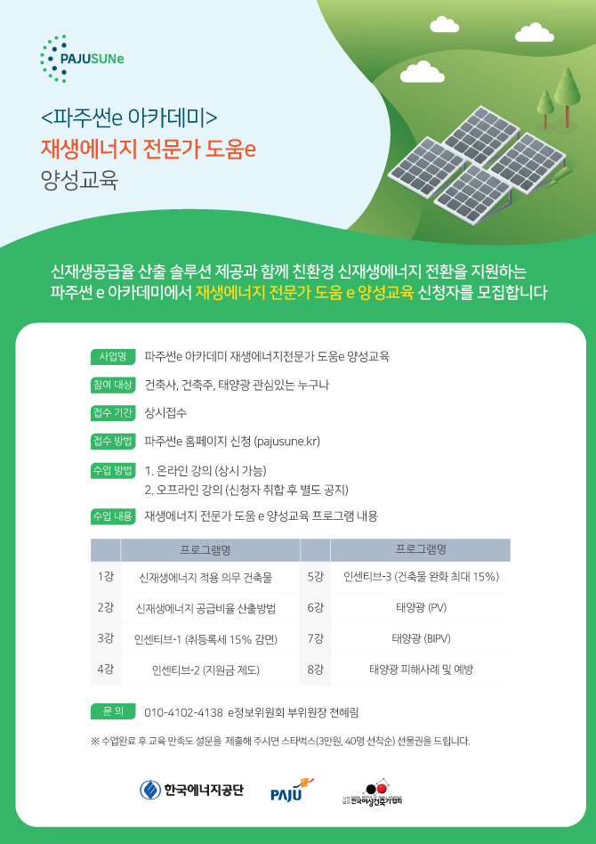 파주썬 e 아카데미에서 재생에너지 전문가 도움 e 양성교육 신청자를 모집합니다
